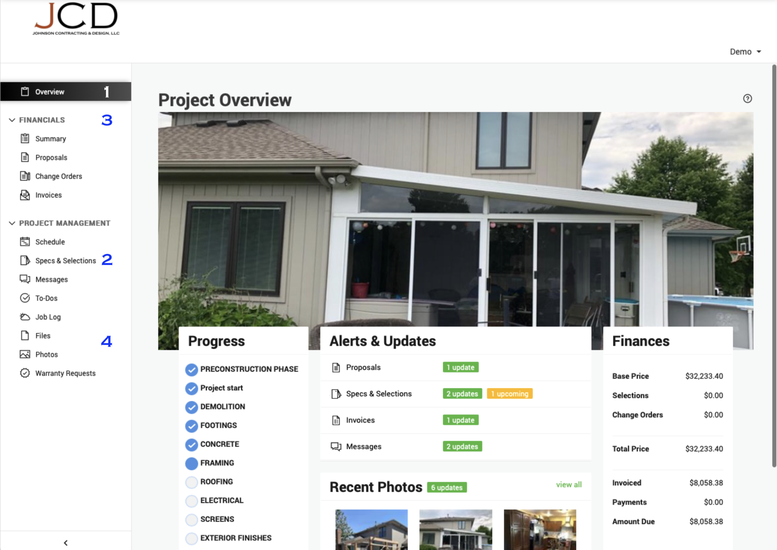 The Project Overview page provides a quick check of the overall project status, including any updated items, new photos, or decisions requiring your attention.
